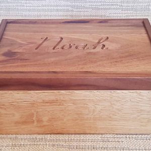 Het houten geboortekistje wordt gepersonaliseerd door de naam van de baby in de deksel te frezen.